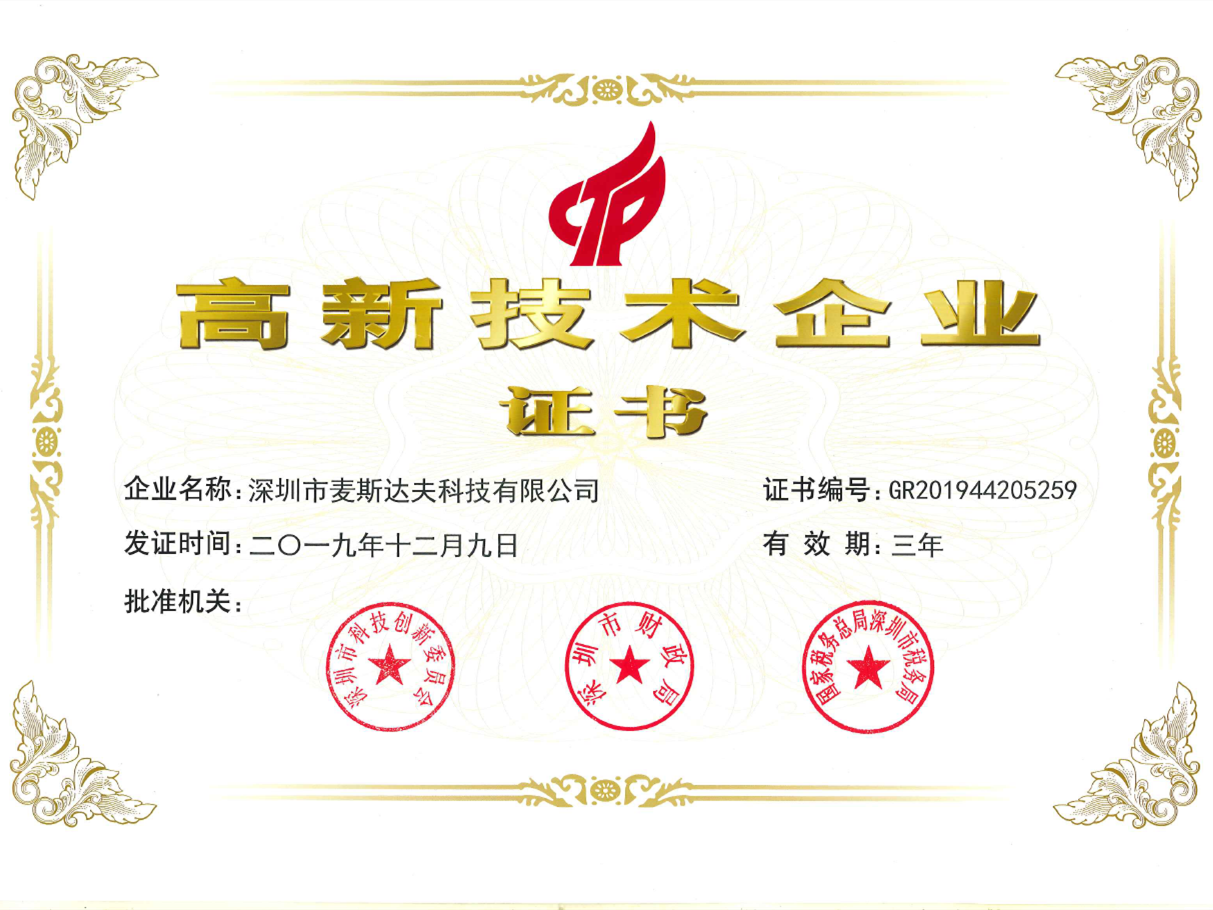 2019年12月9日,深圳市麥斯達(dá)夫科技有限公司獲批“國(guó)家高新技術(shù)企業(yè)”稱號(hào)。