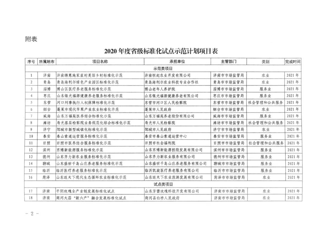 山東省市場監(jiān)督管理局關(guān)于印發(fā)2020年度省級標(biāo)準(zhǔn)化試點示范計劃項目的通知